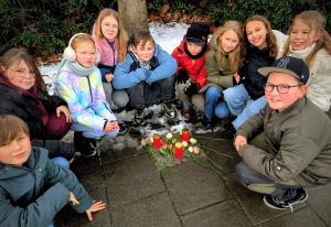 Bei Eis und Schnee putzten die Schülerinnen und Schüler die Stolpersteine von Isidor Blumenthal, der Familie Bartmann und der Familie Friedland, bis sie wieder glänzten und die Namen deutlich sichtbar wurden. Anschließend legten sie Kerzen und Rosen nieder.
