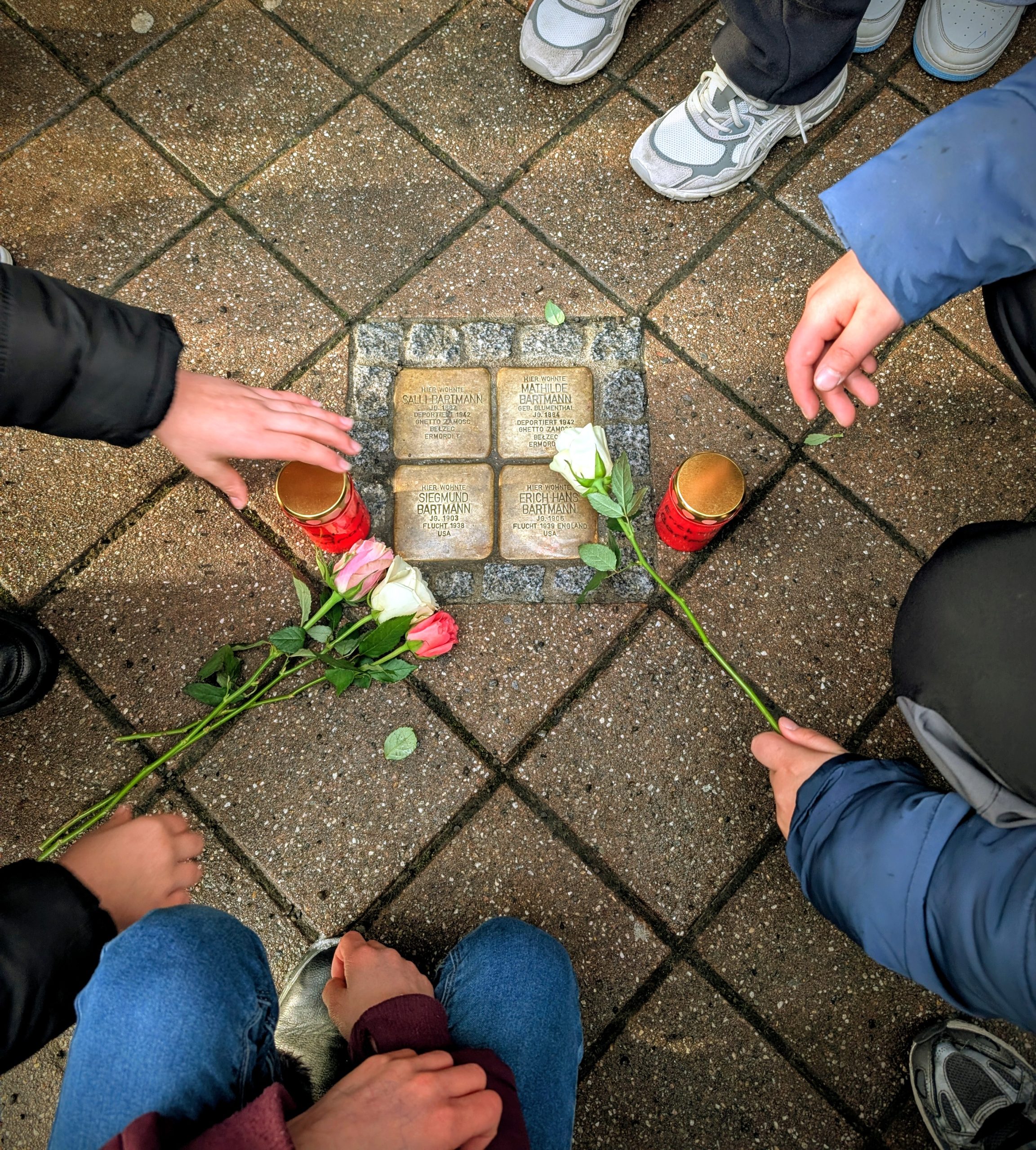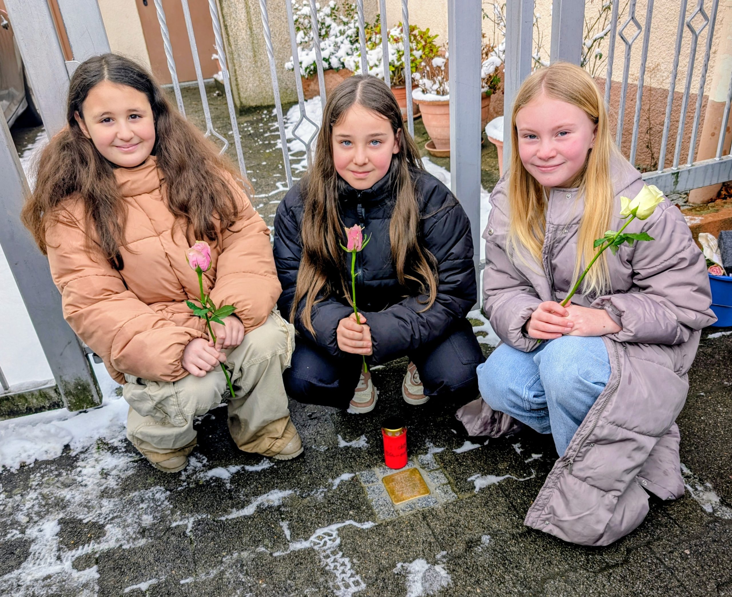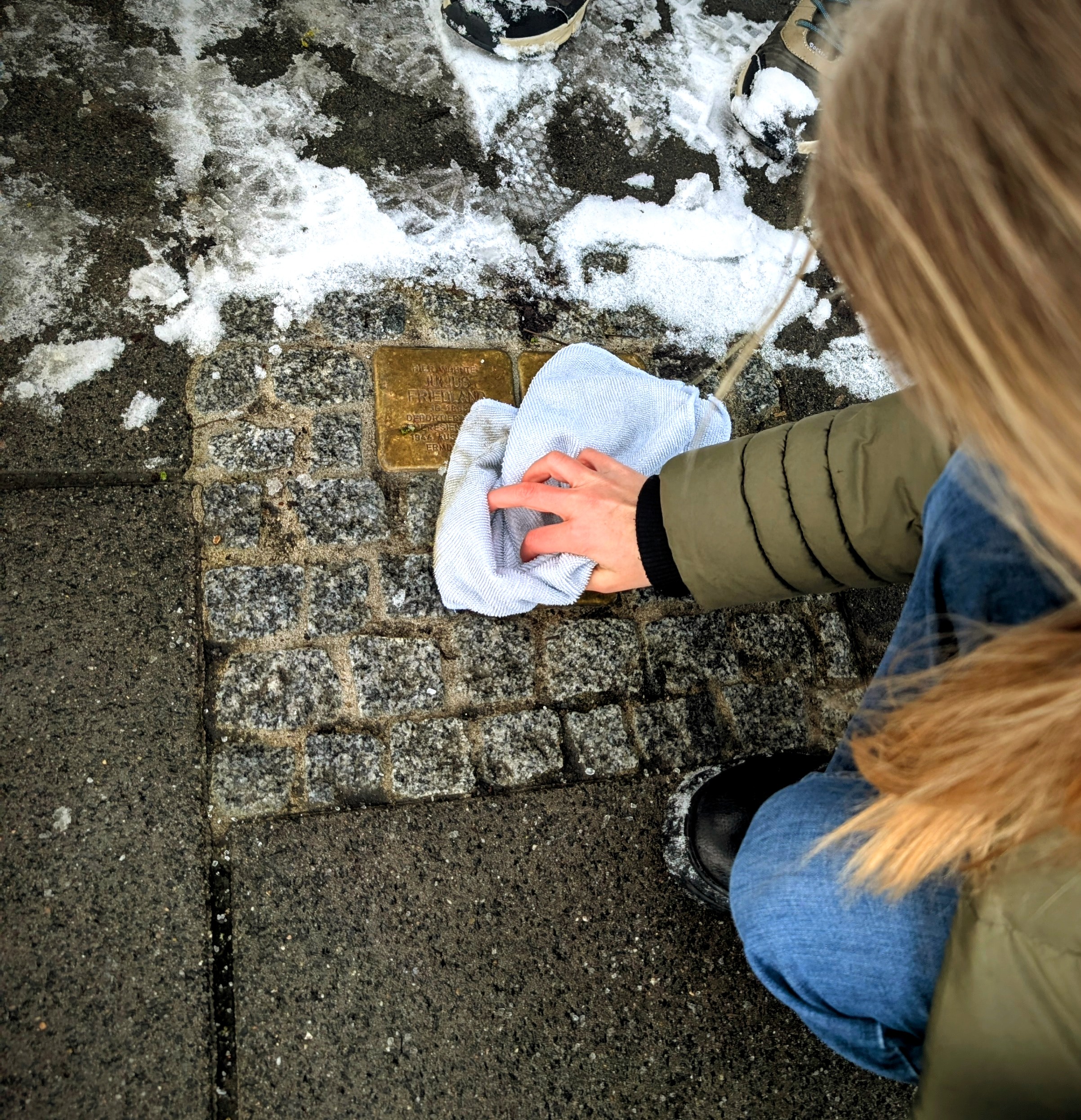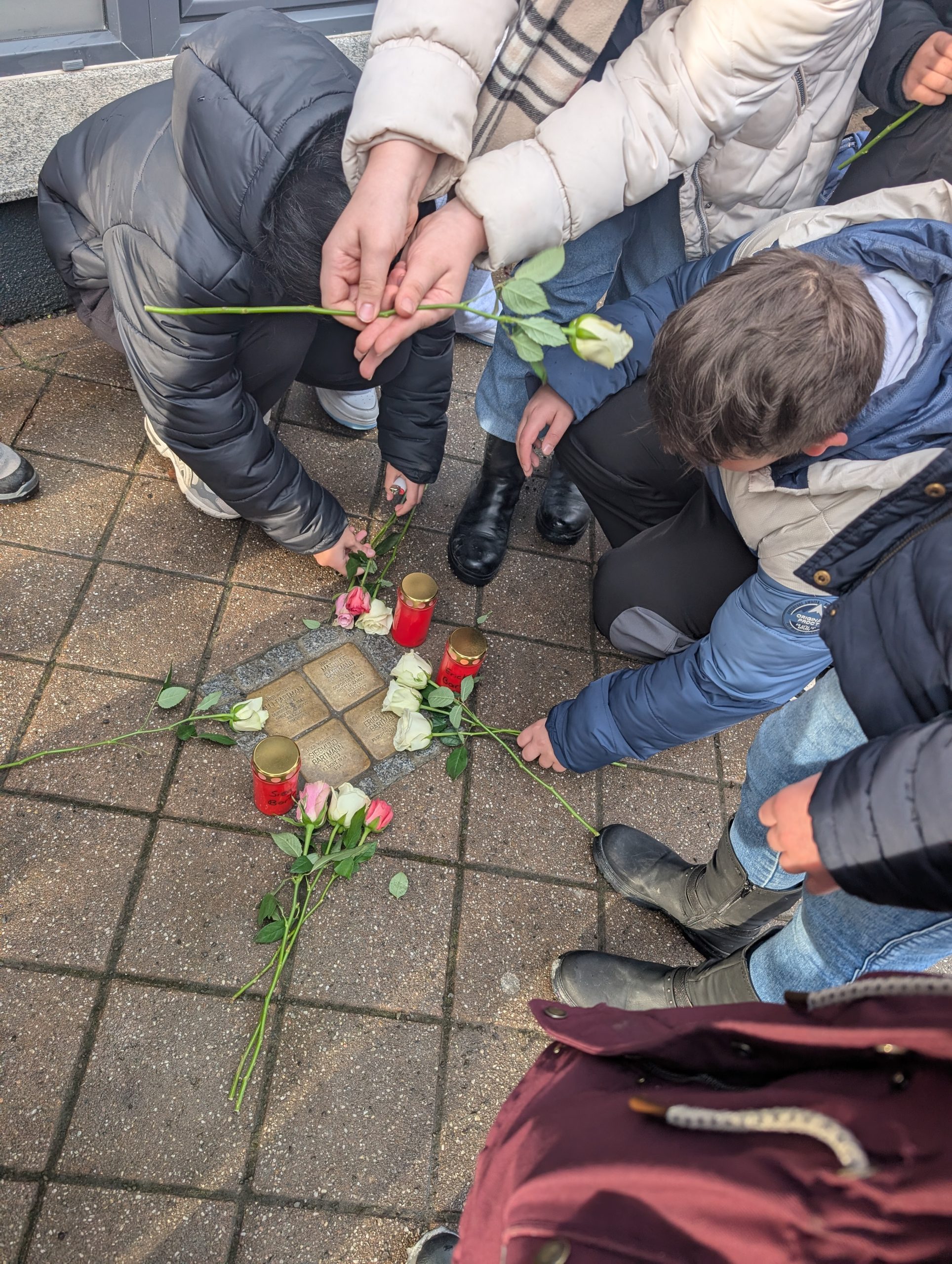 Bei Eis und Schnee putzten die Schülerinnen und Schüler die Stolpersteine von Isidor Blumenthal, der Familie Bartmann und der Familie Friedland, bis sie wieder glänzten und die Namen deutlich sichtbar wurden. Anschließend legten sie Kerzen und Rosen nieder.