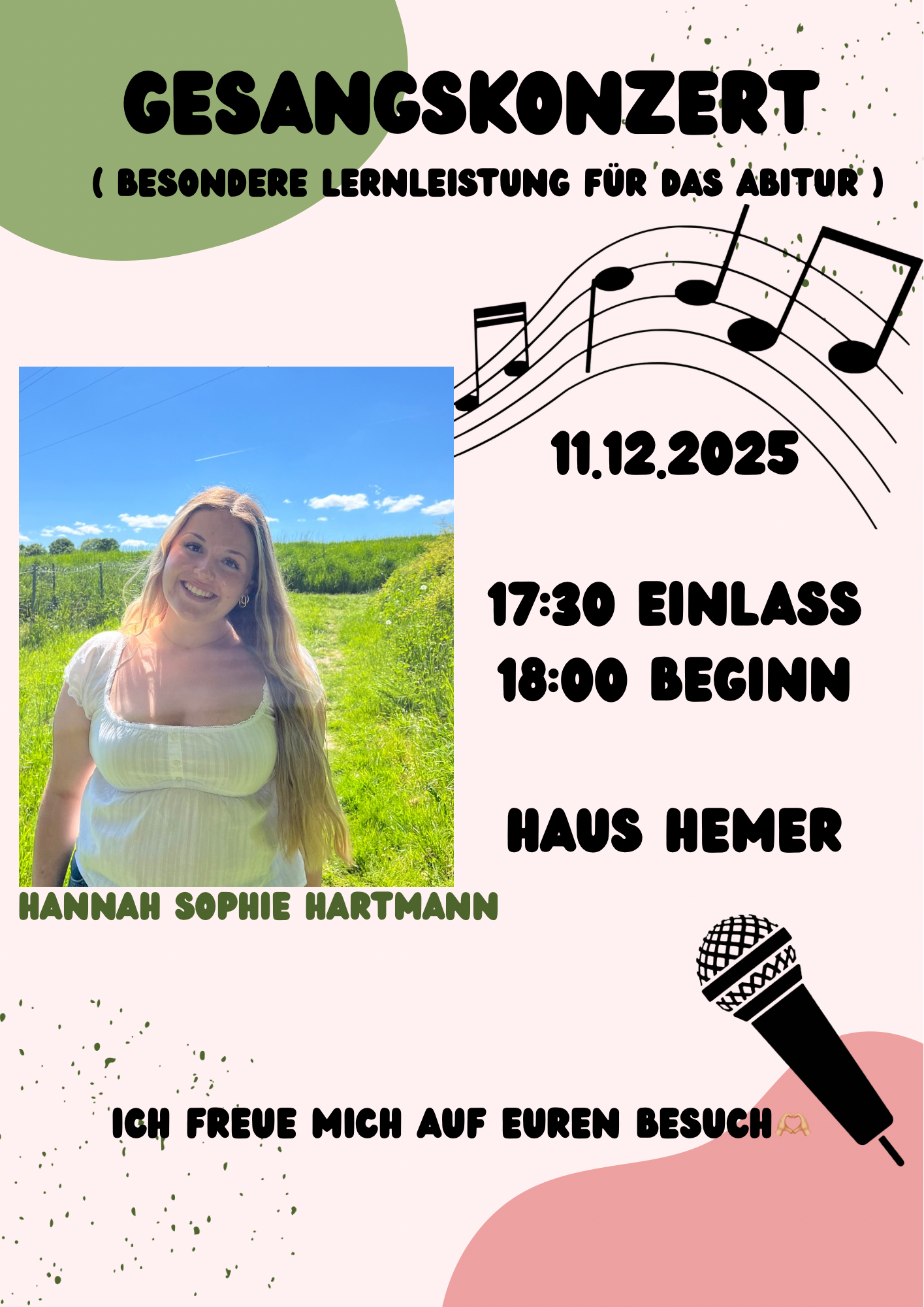 Unsere Q1-Schülerin Hannah Sophie Hartmann lädt zu ihrem Konzert als Zusatzleistung zum Abitur am Donnerstag um 18 Uhr ins Haus Hemer ein.